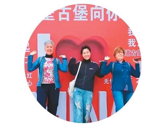 Лю Лилин (дундах) Жанби эртний цайзад гадаадын жуулчидтай зургаа авахуулж байгаа нь Гэрэл зургийг: Ярилцлага өгсөн тал